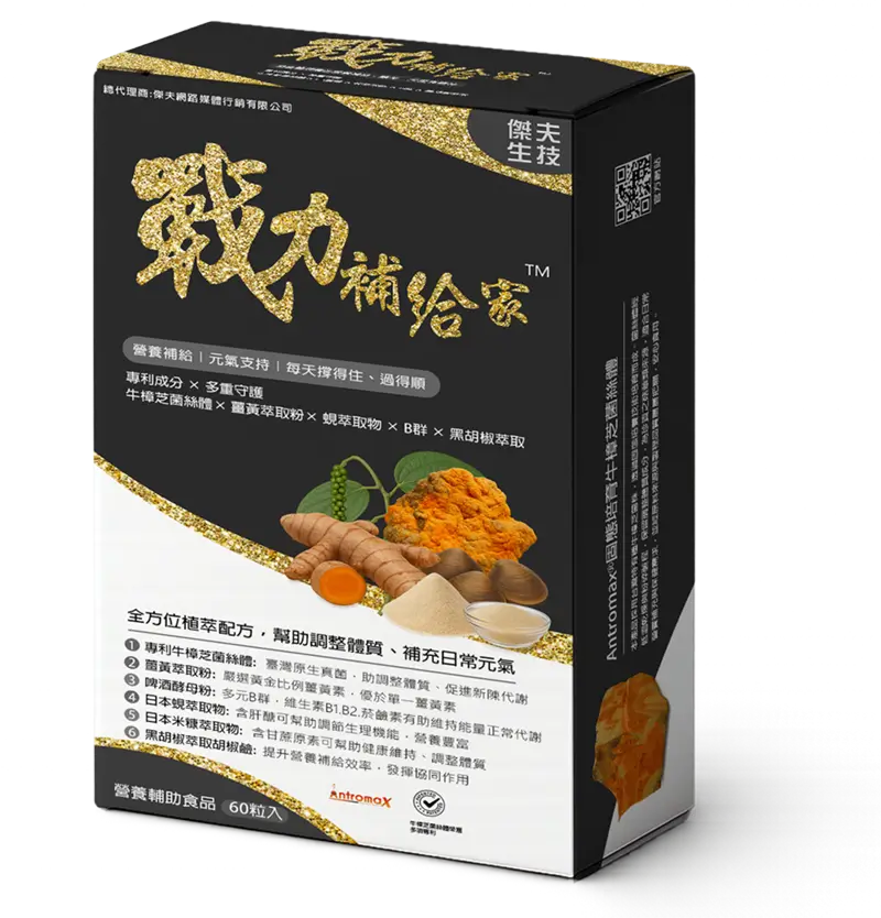 熬夜、外食、作息不規律? 「戰力補給家」嚴選五大植萃與營養配方,輕鬆補充日常所需營養! 嚴選多項優質原料,包括專利牛樟芝菌絲體、C3 專利薑黃萃取物、日本蜆萃取物、維生素 B 群與黑胡椒萃取物, 每顆膠囊集結多重營養,補充忙碌生活中容易不足的營養素。 每日一顆,補充營養、維持健康,陪你穩穩走過每一天。