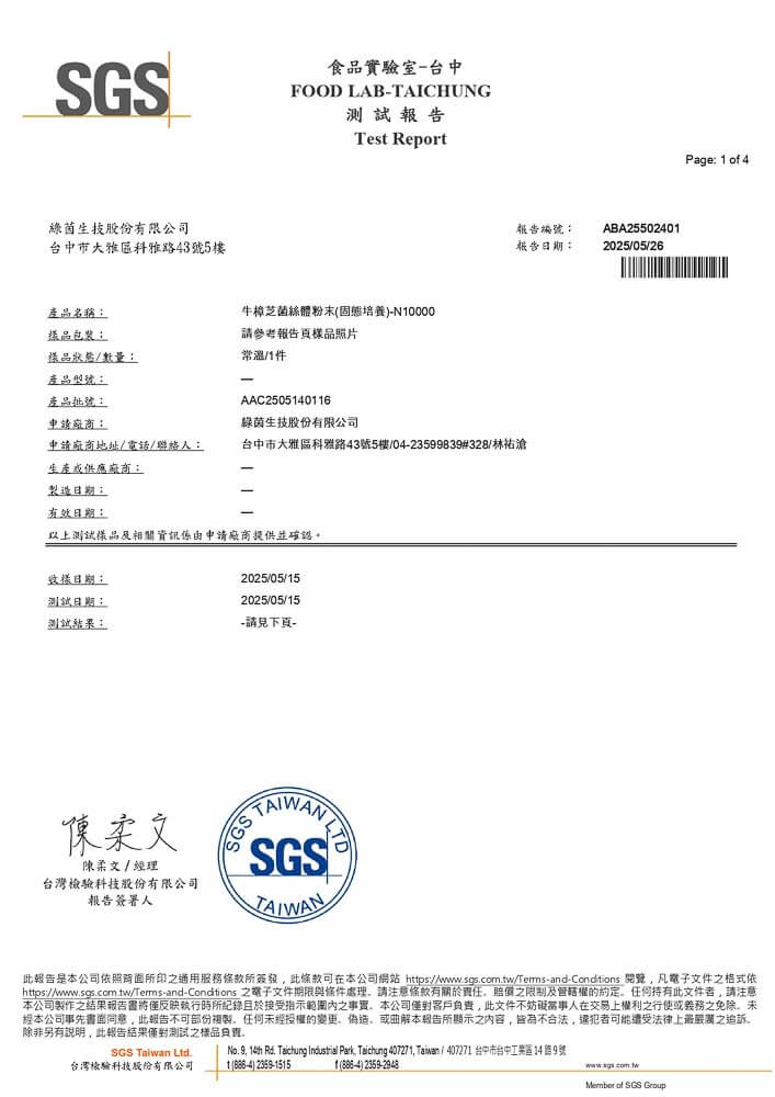 本產品採用台灣特有種牛樟芝菌株,透過固態培養技術培育而成。菌絲體經低溫乾燥與粉碎製程,保留調整體質成分,為珍貴之菇蕈類來源,適合日常營養補充與保健需求,並經原料來源與製程品質層層把關,安心食用。
