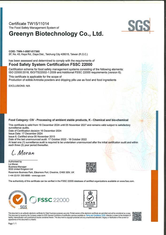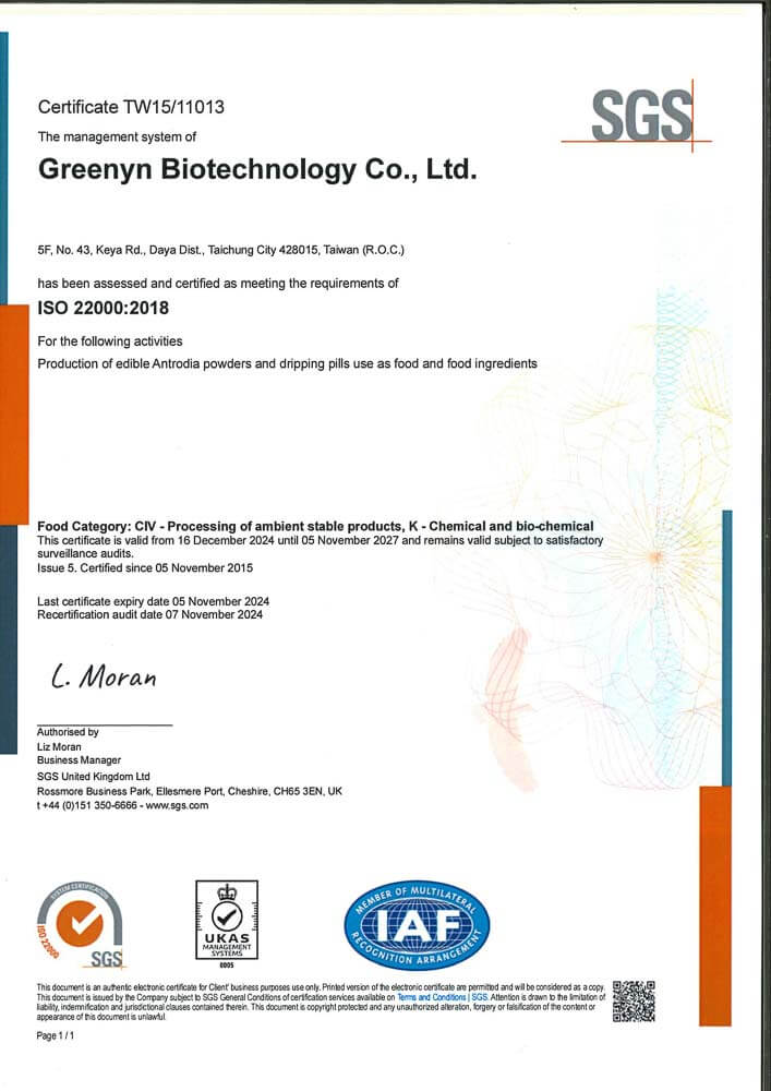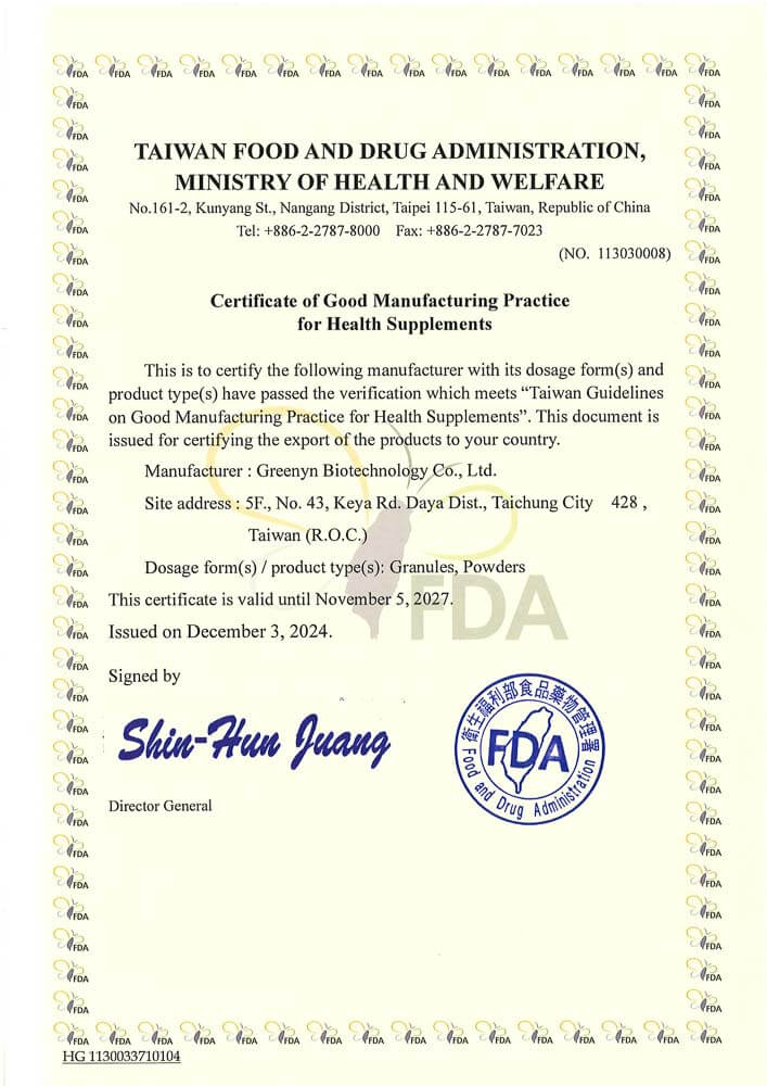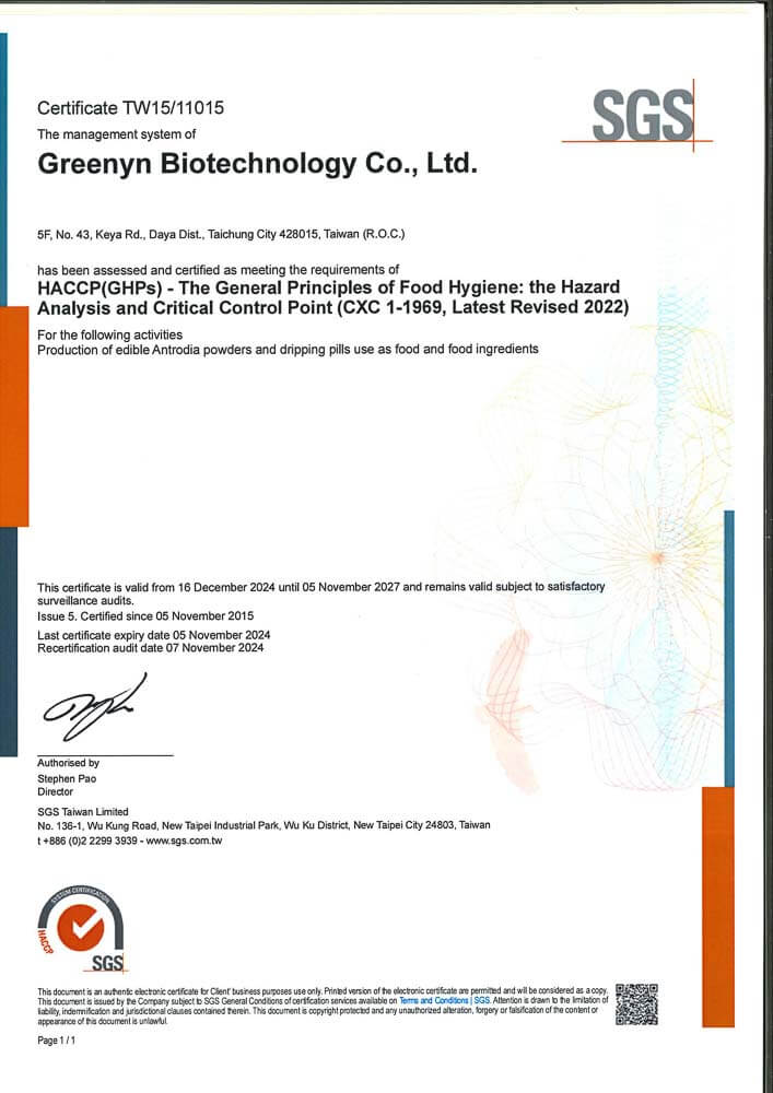 - 專利牛樟菌絲體,採用台灣珍稀原生牛樟菌絲體,富含天然多酚與三萜類成分,是日常保健與營養補充的熱門選擇,受到長時間工作、生活作息不規律者關注。